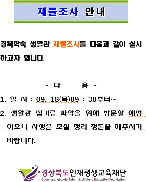 재물조사 안내 페이지 정보 작성자 조인호 조회 459회 작성일 25-09-16 18:00 목록 본문 . 이전글경북학숙 인재키움 장학금 선정인원 안내 25.09.19 다음글경북학숙 도어락 소리 관련 안내 25.09.10 댓글 0 댓글목록 등록된 댓글이 없습니다.