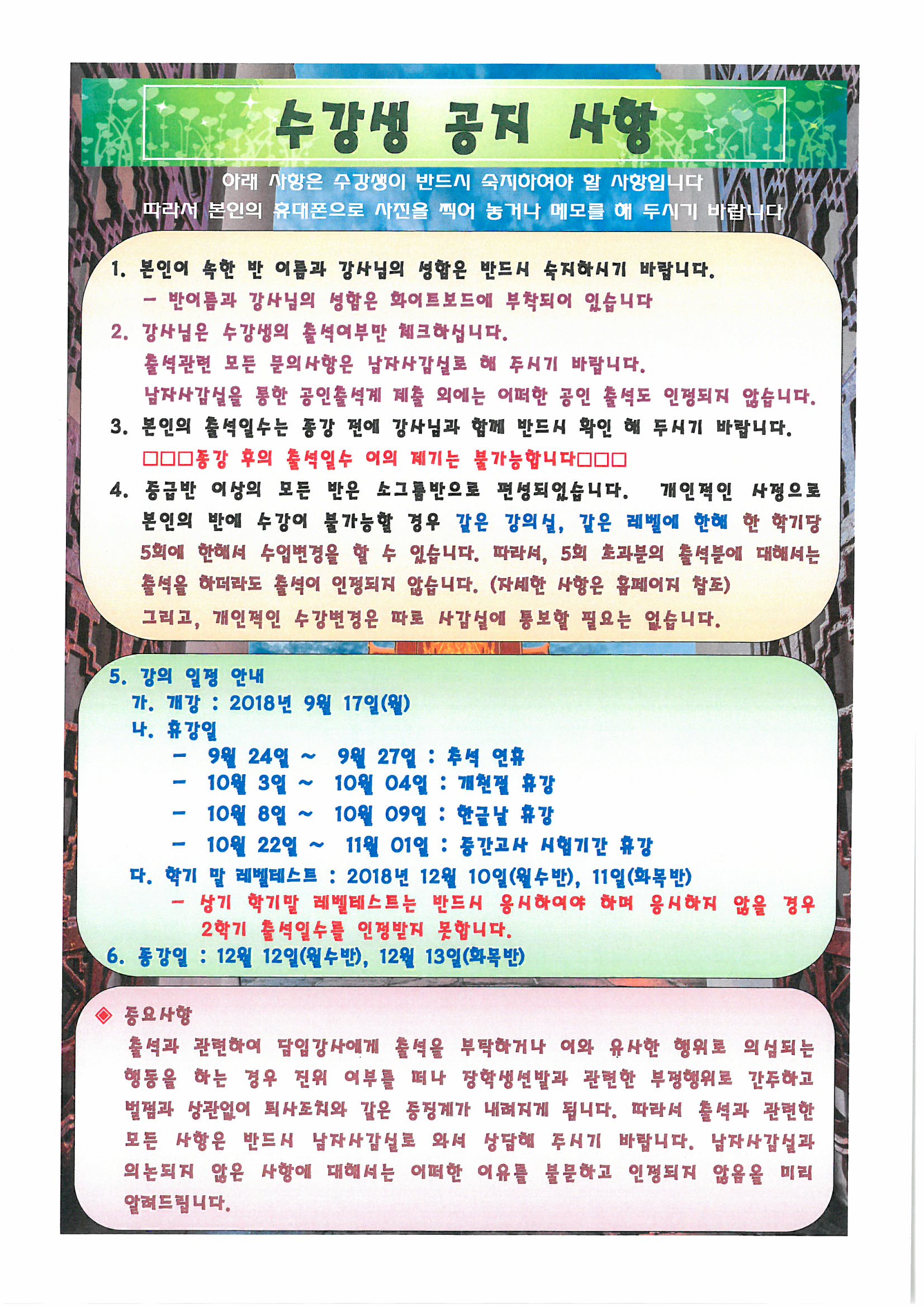 2018년 2학기 영어회화 주요 일정 및 수강생 공지사항