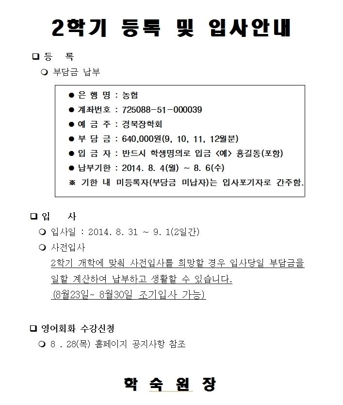 2학기 등록 및 입사안내 페이지 정보 작성자 관리자 조회 9,889회 작성일 14-07-22 10:08 목록 본문 . 이전글방역소독실시 14.07.22 다음글2학기 중도 입사신청 14.06.06 댓글 0 댓글목록 등록된 댓글이 없습니다.