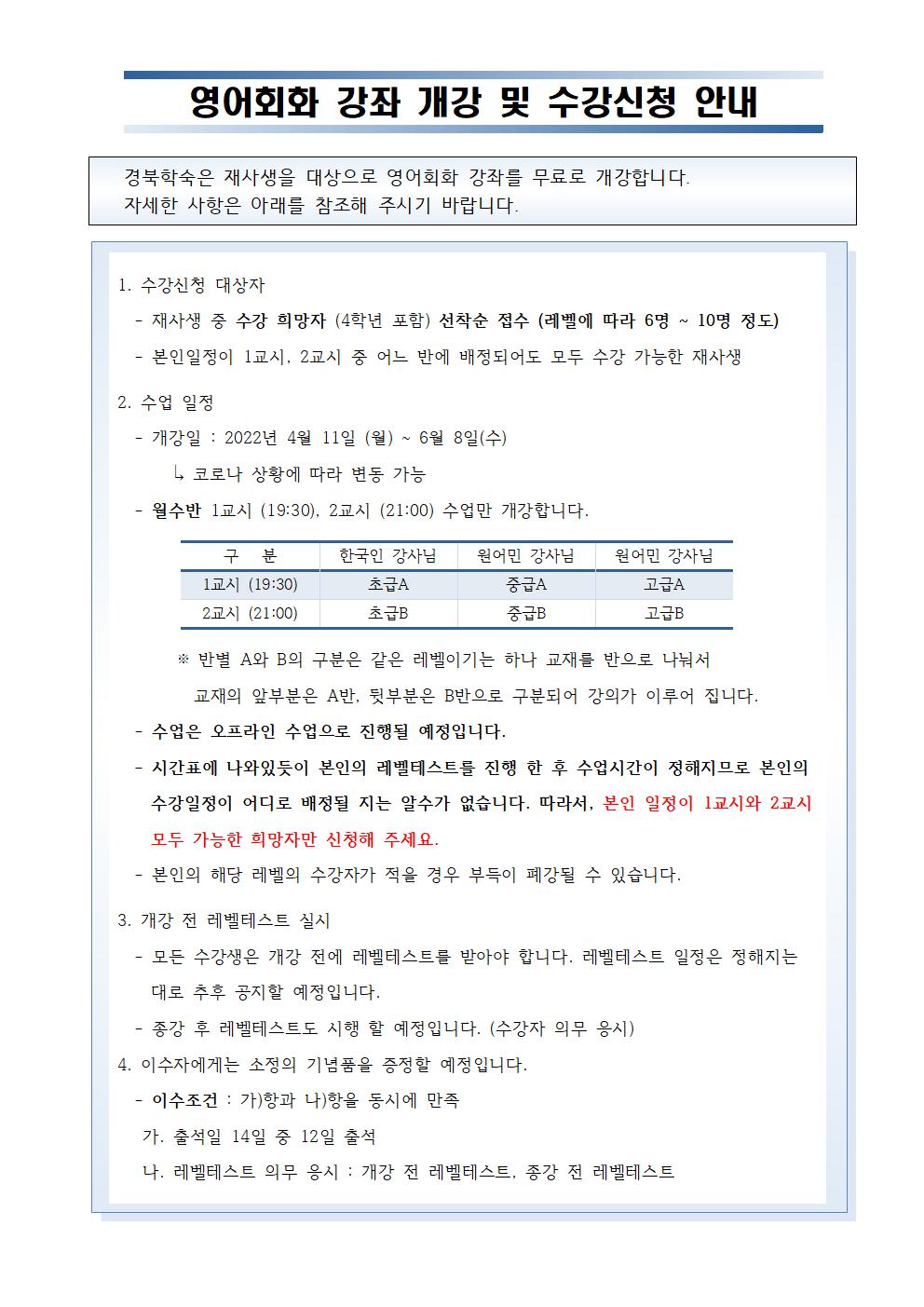 - 이전글토익 입문반 수강신청 안내 (조기마감) : 추후 수강자명단 발표 예정 22.03.22