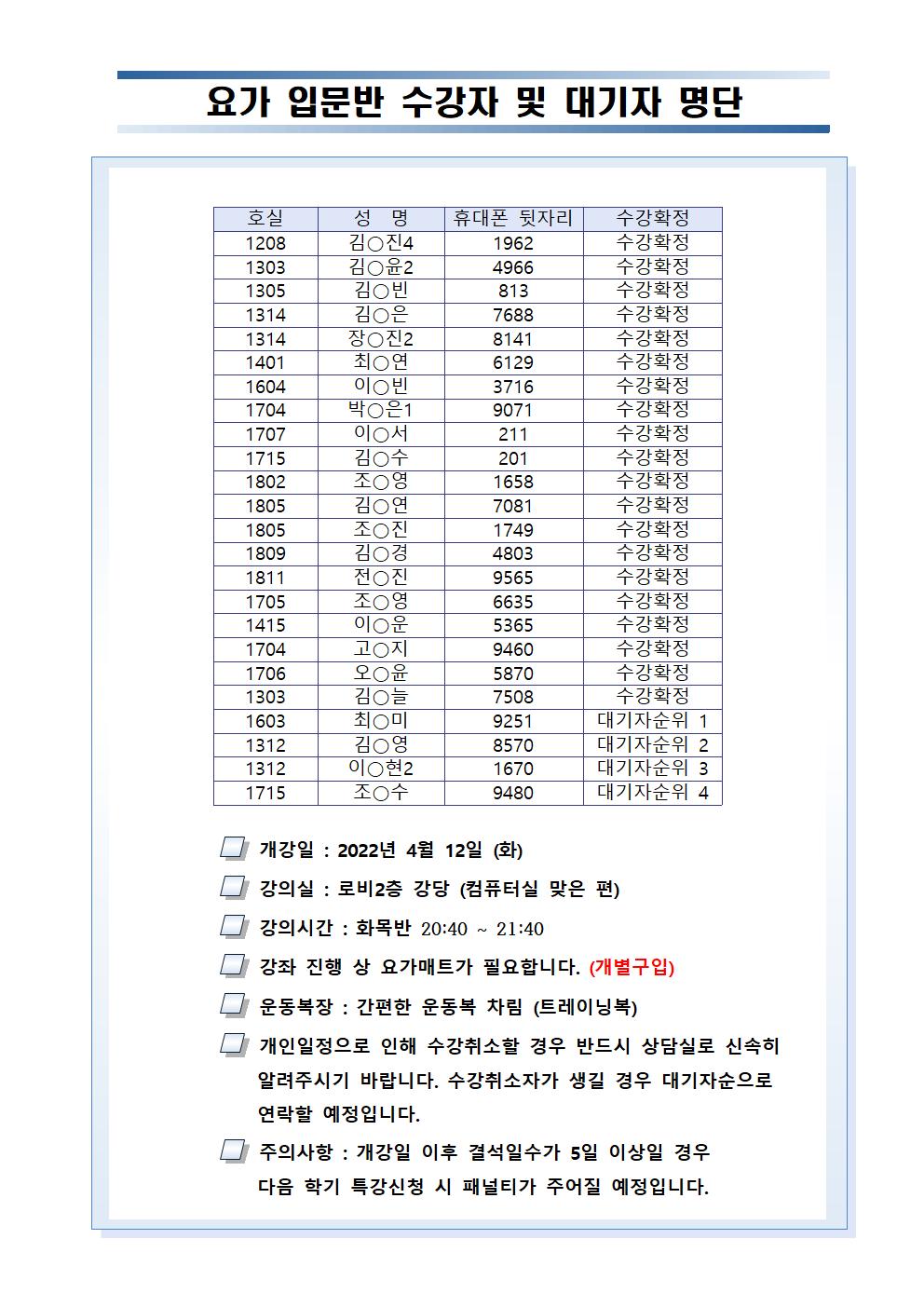 - 다음글요가 입문반 수강신청 안내 (조기마감) : 추후 수강자명단 및 대기자명단 발표 예정 22.03.22