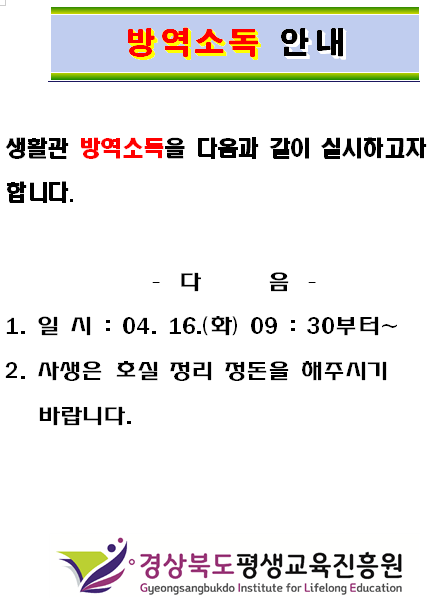 방역소독 안내 페이지 정보 작성자 조인호 조회 92회 작성일 26-04-15 09:39 목록 본문 . 다음글경북학숙 소음관련 안내사항 26.03.25 댓글 0 댓글목록 등록된 댓글이 없습니다.